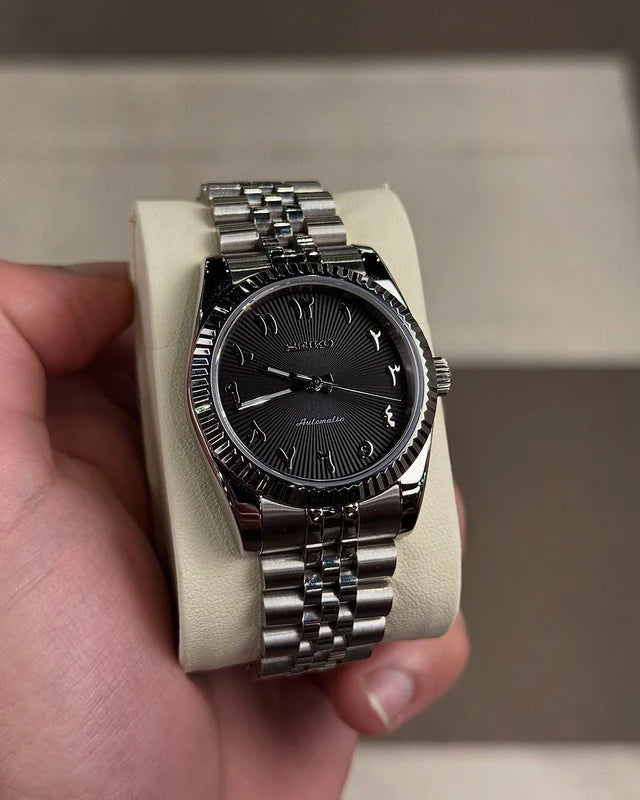Crafted from 904L stainless steel, this custom-modified Seiko is powered by the reliable NH35 automatic movement, fully waterproof up to 200 meters, weighing 140 grams, and completed with a bracelet including extra removable links.